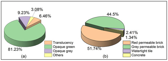 The proportion of (a) roofs and (b) underlying surfaces for the investigated bus shelters in Guangzhou.