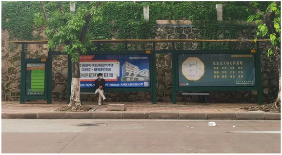Based on the analysis of Guangzhou’s bus shelter characteristics, it can be concluded that the typical style of bus shelters is north–south orientation, with only one station board at the end of the bus, two backboards, two roofs (opaque green), and the underlying surface is made of red permeable brick. Representative stations that fit this description include Xikeng Station, Tuhua village Station, Light Industrial Secondary School Station (Figure 13), etc.