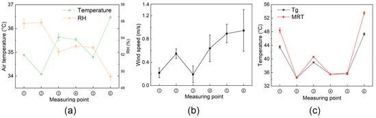 (a) Air temperature and relative humidity (RH), (b) wind speed, and (c) black globe temperature (Tg) and mean radiant temperature (MRT) at each measured point.