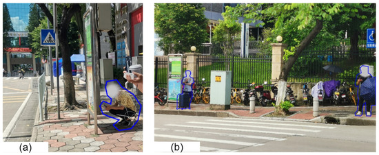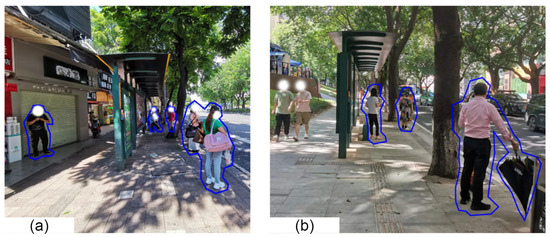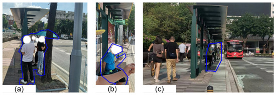 Since there is no bus shelter and trees to shade the sun, the air temperature and black globe temperature are high, so the waiting people adjust their positions according to the sun’s altitude angle, azimuth angle, and direct solar radiation intensity, as shown in Figure 15. When there is no cloud cover and the direct solar radiation intensity is high, the waiting people move to the shadow of the station to relieve their thermal discomfort; when the sun’s altitude angle is high, they will even crouch to ensure that the whole body is in the shadow of the station (Figure 15a). If there is no direct solar radiation, the waiting people will move from the rear of the station to the position near the road to observe whether the vehicle will arrive. Therefore, this waiting area without shade brings great inconvenience to the passengers.