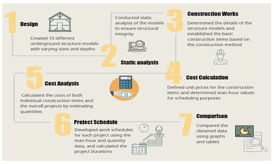 In this study, a detailed analysis and examination of underground structures constructed using top-down and bottom-up (conventional) construction methods were carried out, comparing their costs and time (project duration). The study was conducted in seven steps: Firstly, ten separate underground structure models were designed with two different sizes of construction areas and five different structure depths (or the number of basement levels). Then, the static analysis of these models was performed to ensure structural integrity. The details of the structure models were determined, and basic construction works were created based on the construction method. Unit prices were established to calculate the costs of the items, and man–hour values were determined for scheduling purposes. Quantities for each construction item were estimated, enabling cost calculations both at the item level and project level. Work schedules for each project were developed using the man–hour and quantity data, allowing for the calculation of project durations. Finally, the obtained data was compared using graphs, providing visual and quantitative insights. The flowchart illustrating the seven steps conducted in this study is provided in Figure 1.