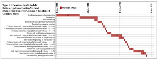 In order to calculate the project duration for the identified models within the scope of the study, the work program for each model was first drawn based on the determined activity relationships and durations. By performing the necessary calculations based on the work program, the project duration was obtained. As an example, the views of the work programs obtained by considering the activity relationships of the tasks determined according to the top-down and down-up construction methods and the structural systems for Type 1.1 building models are presented in Figure 4, Figure 5 and Figure 6.