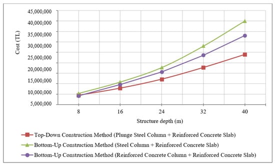 According to the data in Table 6, it appears that the most cost-effective method among structures with an 8 m depth is the “bottom-up (reinforced concrete column + reinforced concrete slab)” construction method. For all other depths greater than 8 m (16 m, 24 m, 32 m, 40 m), the most cost-effective method is found to be the “top-down (immersed steel column + reinforced concrete slab)” construction method. It was determined that the construction method with the highest cost is the “bottom-up (steel column + reinforced concrete slab)” construction method at every depth.