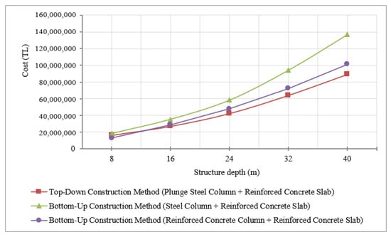 According to the data in Table 7, it appears that the most cost-effective method among structures with an 8 m depth is the “bottom-up (reinforced concrete column + reinforced concrete slab)” construction method. For all other depths greater than 8 m (16 m, 24 m, 32 m, 40 m), the most cost-effective method is found to be the “top-down (plunge steel column + reinforced concrete slab)” construction method. It was determined that the construction method with the highest cost is the “bottom-up (steel column + reinforced concrete slab)” construction method at every depth.