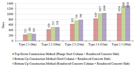 The project durations of the models belonging to the Type 2 structure group, based on the top-down and bottom-up construction methods and the structural system shape, obtained through calculations, are presented in Figure 10. According to the data, it is determined that the most suitable duration for each structure depth is achieved using the “top-down (plunge steel column + reinforced concrete slab)” construction method. For models with an 8 m depth, the longest project duration is observed in the “bottom-up (steel column + reinforced concrete slab)” construction method, while for models with 16 m, 24 m, 32 m, and 40 m depths, the “bottom-up (reinforced concrete slab + reinforced concrete column)” construction method has the longest duration.
