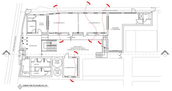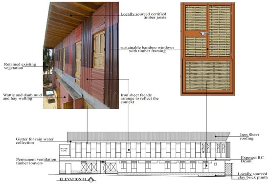 The woven bamboo design on the windows and doors allows air to penetrate the classrooms, facilitating cross ventilation. It also permits natural light to penetrate the classrooms even when the windows are closed. The ground floor wall material allows for an adequate number of windows for ventilation. However, this was a challenge on the first floor, as Arup advised that the required fenestration would compromise the structure (Figure 8).