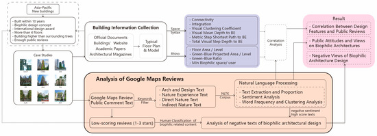 To quantitatively assess the biophilic design of building spaces using a consistent standard, this study focuses on the easily quantifiable, directly exposed natural elements in the objective spatial analysis phase. A traditional architectural and spatial analysis tool, Depthmap+ Beta 1.0 [26], was used to analyze the design characteristics of typical floors. Using the NLTK corpus [27], researchers then conducted natural language processing on public comments from Google Maps. Sentences related to building evaluation and spatial design were filtered, and comments mentioning direct and indirect natural elements were classified. These text groups underwent sentiment analysis, text clustering, word frequency analysis, and negative content semantic analysis. Finally, the correlation between the analyzed results of public reviews and the objective design characteristics of typical floors was examined, discussing the strengths and weaknesses of biophilic architectural design. Detailed technical methods can be found in Section 2.3.
