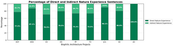 Figure 2 illustrates the composition of comments related to biophilic experiences. Sentences related to direct nature experiences account for more than 65% in all cases, representing an overwhelming majority.