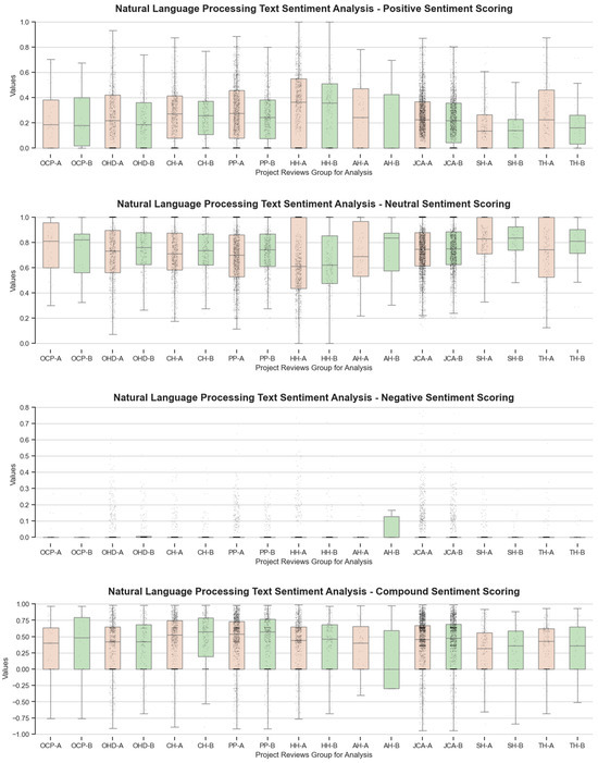 Figure 3 present the results of sentiment analysis, including negative, neutral, positive, and overall scores. In the legends, “-A” and “-B” represent “Architecture & Design related sentences” and “Biophilic Experiences related sentences” for the same project, respectively.