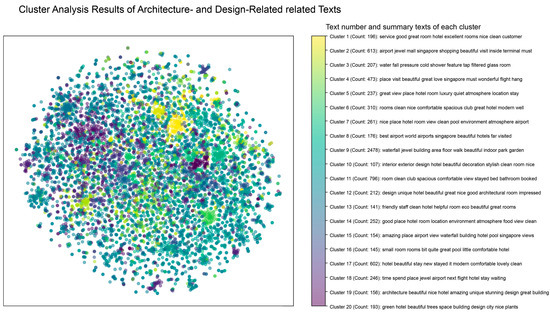 Figure 4 presents the clustering analysis results of architecture- and design-related texts from all cases, including scatter plot mapping, the number of texts in each cluster, and content summaries.