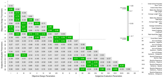Figure 5 presents the Pearson correlation coefficients for the 20 parameters in a matrix format. Parameters I to XI represent objective design parameters, while XII to XX represent subjective evaluation parameters. Cells with a correlation coefficient higher than 0.7 are highlighted in green. The analysis reveals that the greater the total green and blue projected area (I), the higher the frequency of biophilic experience mentions in architectural design evaluations (XVI), with a strong correlation coefficient as high as 0.80. Although the correlation coefficient between III and XVI also reached 0.71, it is difficult to determine a strong relationship between III and XVI due to the high correlation coefficient of 0.96 between I and III.