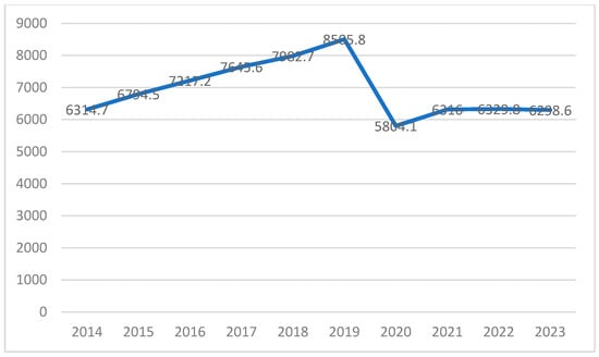 In Table 2, the sectoral incidence rates of work-related accidents of workers in the construction sector during 2021–2022 are compared, where they describe an increase in variation of 0.2 points. In 2022–2023, the values suffered a further reduction, but far from that reflected in the numbers presented in 2020–2021 due to the construction-related total rate of paralysation after the Royal Decree 463/2020 came into force in 14 March, when a state of alertness was declared to manage the sanitary crisis caused by COVID-19 []. This was a scenario that, as time went by, confirmed that this reduction happened because of the total rate of paralysation, not because of an improvement. Figure 1 shows the graphical evolution of the incidence of work-related accidents in the construction sector.
