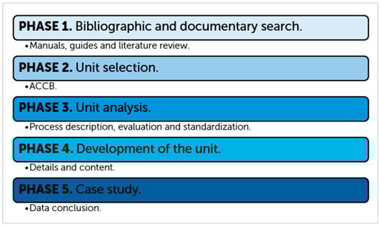 The materials available to develop the work methodology detailed in this article can be grouped into five different phases based on their state of evolution. Figure 3 details how the methodology is grouped into five major phases where the different phases of action and/or execution of the structure are encompassed.
