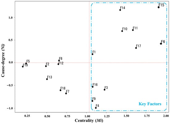 - Analysis of Cause-degree (Ni) and Centrality (Mi): In Figure 2, causal factors are positioned above the axis, indicating that these factors have a significant impact on others. Effect factors are located below the axis, suggesting that these factors are more susceptible to the influence of causal factors. A higher centrality indicates a greater level of importance. The top three factors in terms of influence include automation and digitization (F6), quality management standards (F15), and key technologies and scheme disclosure (F17).