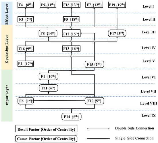 - Operation Layer (Levels IV to VI): Positioned in the middle, this layer contains factors that bridge the foundational input factors with the uppermost effect-oriented elements. It includes intelligent training systems (F1), worker health monitoring (F2), quality management standards (F15), construction project acceptance procedures (F16), and quality protection monitoring in construction site operations (F13).