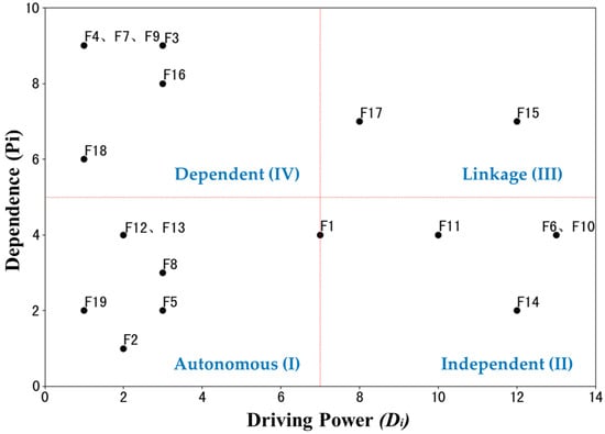 - Independent Factors (Quadrant II): Situated in this quadrant are factors that exhibit strong driving power but low dependency, making them pivotal to the system’s functioning. This group includes intelligent training systems (F1), intelligent management of construction documents and data (F11), automation and digitization (F6), intelligent project management procedures (F10), and regulations and policies (F14). These elements are crucial, often exerting substantial direct influence across the system.