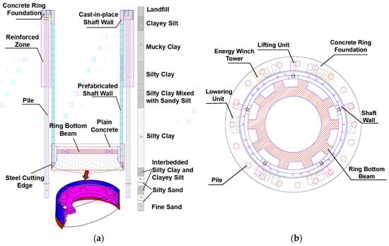With advancements in engineering technology and increasing practical engineering demands, shaft sinking has been developing towards larger cross-sections and greater depths. The shortcomings of traditional self-sinking shafts have become increasingly evident, leading to a sharp decline in their use since the 1990s. They have been replaced by more rational methods such as the Space System (SS) caisson method [], the press-in caisson method, and the Super Open Caisson System (SOCS) method []. In the SS method, the outer contour line of the cutting edge extends approximately 15–20 cm beyond the boundary of the shaft wall. This design creates a gap between the shaft’s outer wall and the surrounding soil during sinking. The space gravel is filled in the gap in order to reduce the peripheral face frictional resistance without compromising stability of the natural ground. Unlike the self-sinking method, a new shaft sinking method that utilises ground anchor reaction devices to press the shaft into the ground has emerged, known as the press-in caisson method []. This method requires the addition of a ground anchor reaction press-in device, and employs through-hole jacks to apply downward pressure on the top of the shaft at the surface, addressing the issues of difficult and slow sinking. Additionally, by adjusting the downward pressure at different positions, the shaft’s attitude can be adjusted and corrected, making it suitable for construction projects with stringent environmental control requirements. Based on the press-in method, a newer sinking technique is the Super Open Caisson System (SOCS), which was developed in Japan []. It uses an underwater excavator mounted on the inner shaft wall to dig the soil below the footing to the centre of the shaft, and then discharges the sludge by means of a grapple or a slurry pump, thus reducing the resistance to sinking of the cutting edge, and then the shaft is pressed into the ground by the ground anchor counter-force device. The SOCS method is well-suited for construction projects in urban areas with high-speed construction requirements and stringent environmental controls. Engineers have also improved the underwater excavator, developing a new type of excavator suitable for non-standard cross-section shafts, significantly broadening the application scope of the SOCS method.