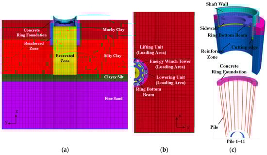 The reinforced zone is modelled using the Mohr–Coulomb model, a widely recognized elastic-plastic model for simulating soil behaviour. The soil strata in the simulation primarily comprise 18 m of mucky soil, followed by 33 m of silty clay, and 8 m of clayey silt, culminating in a fine sand layer at the bottom. To accurately represent the structural components, the shaft wall, ring foundation, and ring support beam are simulated with the elastic model, while the pile foundation is modelled using a combination of structural and pile elements. The selected key parameters for these components are given in Table 3, based on previous studies [,]. A noteworthy aspect is the consideration of buoyant density of the concrete located below the water table. This buoyant density is calculated by subtracting the density of water (1000 kg/m3) from the density of concrete, effectively accounting for the buoyancy effect in the simulation.
