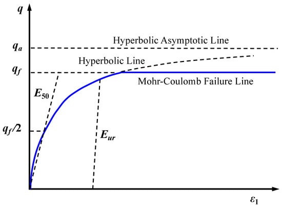 where the failure ratio = / has a value smaller than 1 (typically, = 0.9 is used), and is the ultimate deviatoric stress, which is consistent with the Mohr–Coulomb failure criterion (Figure 4). For a standard drained triaxial test, the connection between the axial (vertical compressional) strain, ε1, and deviatoric stress, q, is graphically represented in Figure 4 with the cut-off qf.
