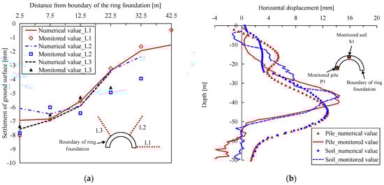 Comparison of numerical values with monitored values: (a) surface settlement; (b) horizontal displacements of piles and soils along the depth.