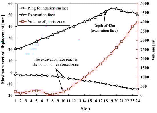 Despite the limited influence of the reinforced zone’s strength on soil deformation, as shown in Figure 11, the total volume of the plastic zone surrounding the shaft exhibits a reduction after the completion of the sinking process. While the plastic zone’s volume is not a direct safety indicator, it does provide insight into the degree of soil disturbance caused by excavation. Its reduction, therefore, contributes to improving the structural stability. Notably, the soil in the vicinity of the reinforced zone remains free of plastic zones, indicating its reinforcing effect.