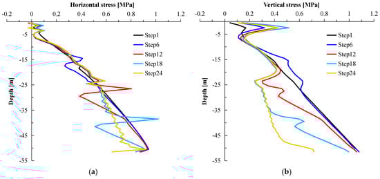 The soil displacement’s influence on the piles results in a similar trend in the horizontal displacement variations of both piles and soil along the depth. Notably, the maximum horizontal displacement of Pile 1 (P1) and the monitored soil layer (S1) along the vertical axis occurs at a depth of approximately 40 m, reaching a magnitude of 15 mm (Figure 5b). Conversely, the numerical model predicts a maximum displacement towards the shaft of 13 mm at a depth of roughly 45 m.