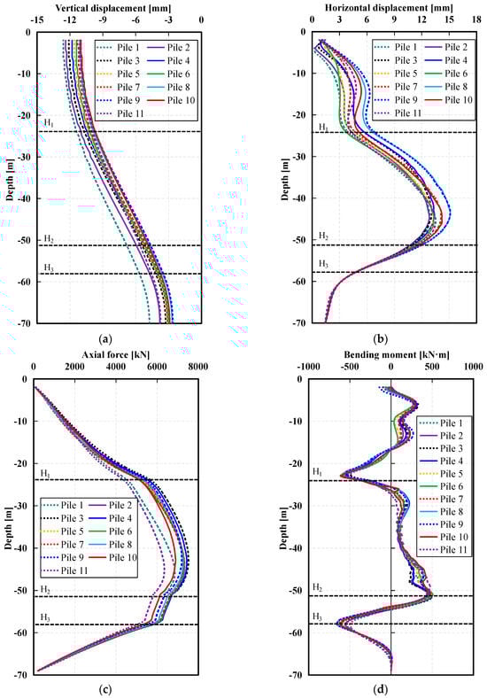 The variation in axial force shown in Figure 9c exhibits a similarity to the horizontal displacement patterns displayed in Figure 9b, particularly within the range of H1 to H2, where values are comparatively high. Among the piles, Pile 3 experiences the highest axial force, reaching 7520 kN, closely followed by Pile 4. This underscores the complexity of pile interactions, revealing that the greatest deformation does not always correspond to the highest axial force. Turning to Figure 9d, the differences in bending moments (Mv) among the piles are relatively small. There are three distinct peaks in the bending moment profiles: at the bottom of the reinforced zone, at the final depth, and notably at a depth of −58 m, termed H3, which marks the interface between the hard and soft soil layers. This peak at H3 arises from the abrupt change in horizontal displacement as the piles traverse from the clayey silt layer to the fine sand layer. Consistent with their large horizontal displacements, Piles 8 and 9 have relatively high total bending moments. The maximum recorded bending moment recorded is approximately −660 kN·m.