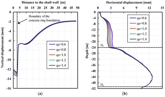 Monitoring points have been strategically positioned along the L1 direction (Figure 5a) to track the ground surface subsidence variations after sinking, particularly those influenced by varying reinforced zone strengths. The concrete ring foundation, with a width matching the thickness of the reinforced zone, is primarily the area most affected by this variable, while the influence on other regions is negligible (Figure 10a). Notably, the vertical displacement at the most affected location shows a mere decrease of 0.9 mm. Furthermore, it becomes evident that the impact of reinforced zone strength on vertical displacement diminishes as the qu increases.