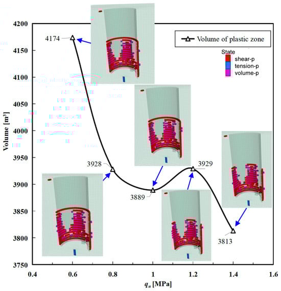 As qu increases from 0.6 MPa to 1 MPa, the plastic zone’s volume decreases by 7%. When qu rises further to 1.4 MPa, the plastic zone diminishes by an even greater margin of 8.6%. However, interestingly, at qu = 1.2 MPa, the plastic zone’s volume slightly increases compared to qu = 1 MPa. Considering both economic factors and the reinforcement effect, it is advisable for this project to maintain the unconfined compressive modulus of the reinforced soil at approximately 1 MPa.