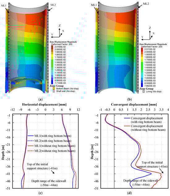 Comparison of shaft wall displacement with and without the ring bottom beam. (a) deformation of shaft wall with ring bottom beam (deformed factor: 200); (b) deformation of shaft wall without ring bottom beam (deformed factor: 200); (c) horizontal displacement of monitoring lines; (d) convergent displacement with depth.