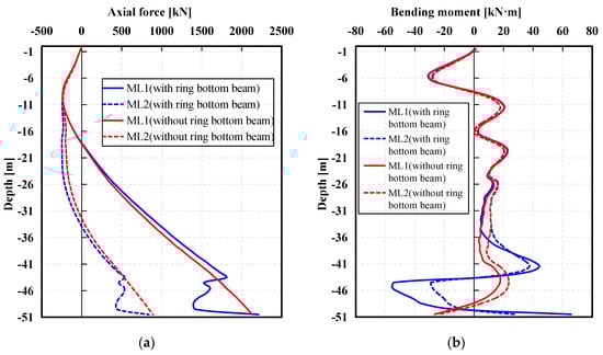 The axial forces of the shaft wall along ML1 and ML2 (Fv) are presented in Figure 13a. Due to the deviation of the shaft wall, the Fv acting on M1 and M2 is not symmetrical. Below a depth of −11 m, the difference in Fv between ML1 and ML2 begins to increase significantly. The largest disparity occurs at the cutting edge, where ML2 exceeds ML1 by approximately 1370 kN in both cases with and without the ring bottom beam. However, within the depth range of sidewall (−50 m to −44 m), Fv is notably reduced in the presence of the ring bottom beam, decreasing by approximately 35 kN~654 kN. Nonetheless, Fv at the cutting edge returns to a level similar to that without the ring bottom beam.