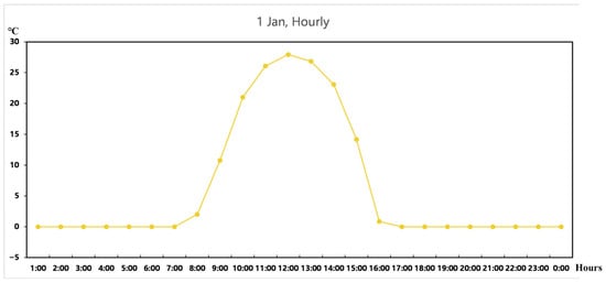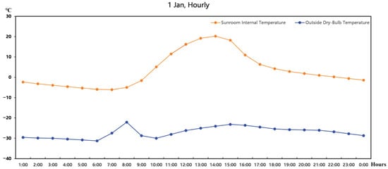 - In Mode 2, the additional sunroom continuously captures solar energy during the day, maintaining the sunroom temperature and continuously providing energy for the ASHP’s heating. All the heat required for the building’s heat load is provided by the air-source heat pump, achieving the design target indoor temperature of 20 °C. The input heat of the air-source heat pump is less than the heat gained by the heating sunroom, indicating that under the given conditions, the input heat of the air-source heat pump can be fully supplied by the sunroom, as shown in Figure 13.