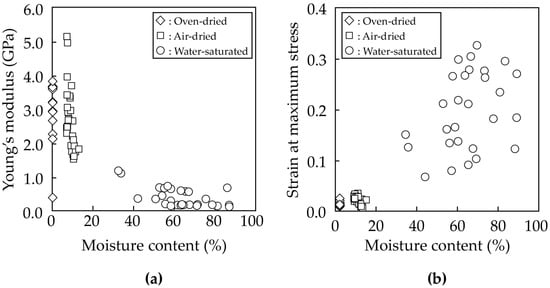 | Specimen | Moisture Condition | Moisture Content (%) | Density (g/cm3) | Young’s Modulus (GPa) | Strength (MPa) | Fracture Strain | Toughness (MJ/m3) |