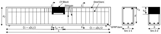 As shown in Figure 1, the effective depth, the concrete cover thickness, the height of the CY block and its relative length are , , and , respectively. To determine the moment resistance of the CY beam, a section analysis shall be conducted with the following assumptions [25,26]: