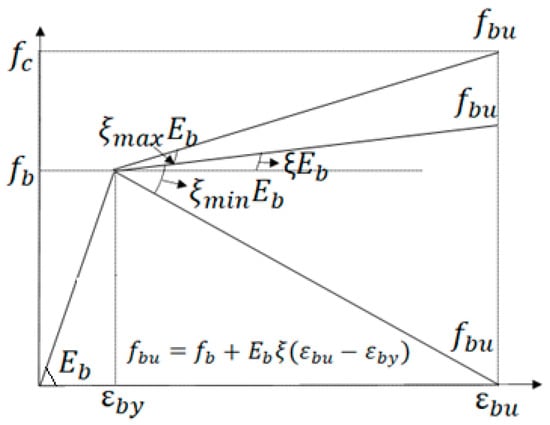 The stress–strain relationship of the CY material is shown in Figure 2. and are the yield strength and ultimate strength of the CY material, respectively, and is the compressive strength of concrete. and are the yield strain and ultimate strain of the CY material. is the elastic modulus of the CY material, and is the post-yield modulus ratio ( is the minimum value of , and is the maximum value of . The constitutive model of steel is assumed to be elastic and perfectly plastic, while the model for FRP is assumed to be linearly elastic, and a triangular model is employed to describe the behaviour of concrete [25,26].