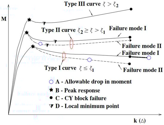 There are two possible failure modes for a CY beam: (1) failure mode I—CY block failure—in which the ultimate failure is governed by the attainment of the ultimate strain in any part of the CY block; and (2) failure mode II—the moment resistance drops below an allowable limit after reaching the peak and before CY block failure, i.e., the rate of moment drop (RMD) the limit of the moment drop () before CY block failure, where is given by Equation (11).