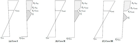 The peak moment () at point B is the focus of this study as the aim is for the ultimate limit state functions. The three potential cross-section strain distributions at the peak of point B (Cases I, II and III) are shown in Figure 4. Based on the strain distributions at point B, the peak moment or flexural resistance of the CY beam is derived, and finding this flexural resistance is the key step for the reliability analysis. The CY material parameters are based on the strain distribution curve. In Figure 4, is the elastic modulus of the FRP, is the maximum allowable strain of FRP, and is the strain at the concrete–CY block junction, where the subscript -1,2,3 indicate Cases I, II and III, respectively. is the elastic modulus of concrete, is the elastic modulus of the CY block equal to , is the yielding strain of the CY block, and is the compressive strength of concrete.