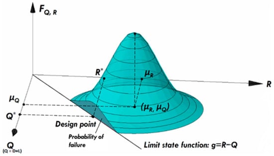 For the limit state function in Equation (16), , where and are independent random variables, and then and where = the mean resistance, = the mean load, = the standard deviation of the resistance, and = the standard deviation of the load. Then, the reliability index can be calculated using the following formula from Cornell [39]: