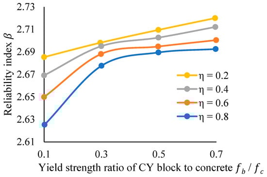 Influence of yield strength ratio of CY block to concrete on reliability index.