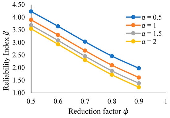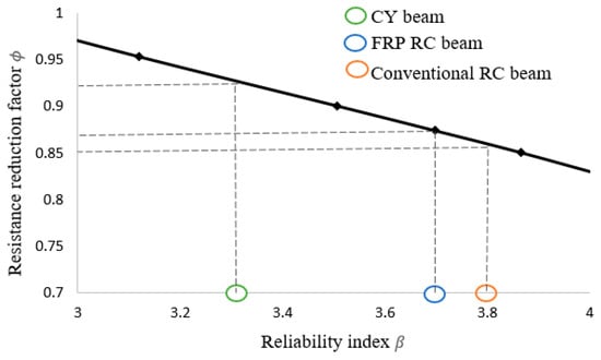 Next, the deviation in the reduction factor for the reliability index for different load ratios is shown in Figure 11. It can be seen that the trend corresponding to different load ratios () follows a similar descending pattern when plotted for the reliability index versus resistance reduction factor. For example, when and , the reliability index drops from 3.64 to 3.3 for . However, on further increasing the values to 1.5 and 2, there are insignificant changes to the reliability index at 3.08 and 2.93. This indicates that the CY beam has better reliability at a specific load ratio, beyond which the values start converging. When , the reliability index value further decreases with the increased load ratio and reaches the minimum value with a higher load ratio. In the case of wind load and seismic load, the trend of the corresponding load ratio can be similar which needs further research. Thus, CY beams have higher resistance and better reliability levels for different load ratios compared to FRP-reinforced concrete beams. In the subsequent section, the resistance factor of the CY beam is compared with the RC beam and FRP-reinforced concrete beam.