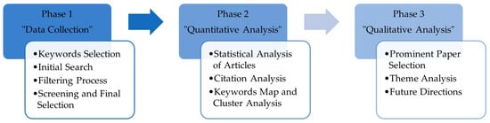 A bibliometric analysis was first introduced by [] as it was identified as “the application of mathematical and statistical methods to books and other media of communication”. This method replaced the statistical bibliography and expanded as a scientific technique for conducting scientific research []. This study implemented a mixed-method approach combining quantitative and qualitative research methodologies, enhancing the strengths and minimizing the weaknesses of the monomethod research []. The three phases of the research methodology are: (1) Data Collection, (2) Quantitative Analysis, and (3) Qualitative Analysis, as shown in Figure 1.