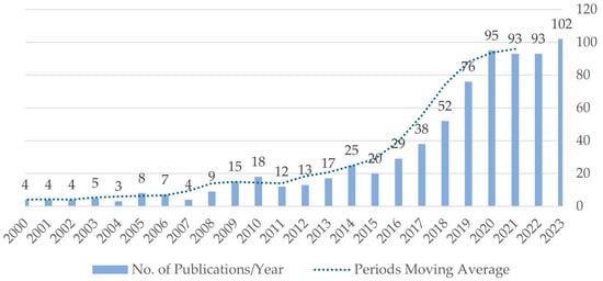 The number of articles on ANNs increased steadily until 2008. The first peak line between 2010 and 2013 refers to the development phase of the ANN’s contribution to information technology beforehand []. Figure 3 shows an evident increase in the publication rate within the past five years (2019–2023). The volume of publications has almost doubled between 2018 and 2020.