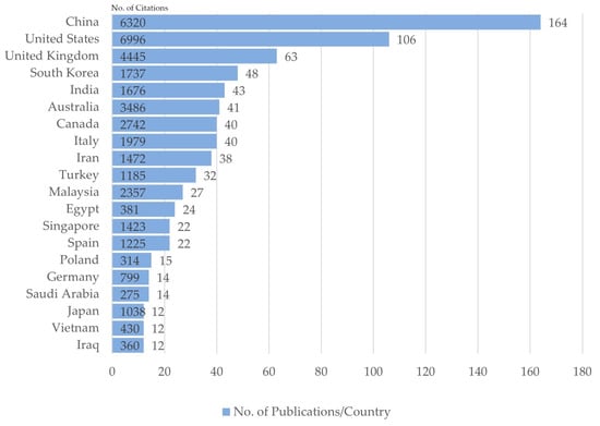 The geographical distribution of the research articles based on the correspondence author’s country is shown in Figure 4. China leads the list with 160 publications that have over 6300 citations. This corresponds with the country’s drive towards a new generation of artificial intelligence []. Research articles originating from the United States were cited slightly as the highest. However, China seems to be catching up on citation numbers, even though it has had this rigorous rise only after 2020. The top 20 active countries listed according to the number of publications as a bar chart with an indication of the number of citations per country are shown in Figure 5. The chart aligns the citations for these publications for the quality indication. This analysis identified China, the United States, the United Kingdom, South Korea, and India as the top five countries for publications on ANNs in construction research. Moreover, the citation numbers of quite a lower number of publications refer to the high-quality research in countries such as Australia, Canada, Malaysia, and Japan.