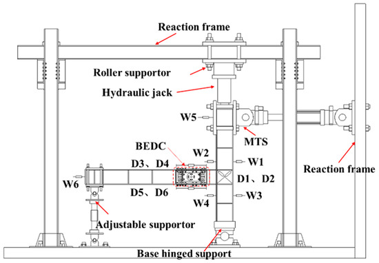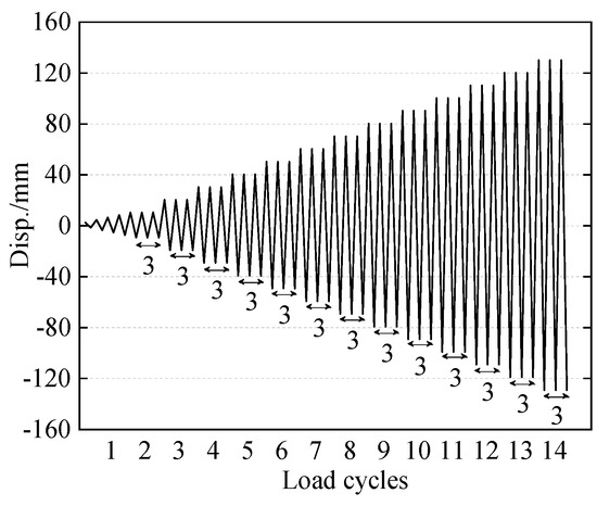 Figure 3 exhibits the test set-up for the BCJ-BEDC, from which it was seen that a hinged support was adopted at the column base, while an adjustable roller support was set at the beam end. The column was connected to a hydraulic jack at the column top, which was used to apply the vertical load, and the axial compression ratio was set as 0.3. The lateral cyclic load was applied by a 500 kN MTS system at the upper column. A preload test was conducted first to check whether all instruments worked normally. Figure 4 shows the loading protocol, which was determined according to AISC seismic provisions [31]. At the initial loading stage, each displacement level was repeated, and then each displacement load level was repeated 3 times. When the bearing capacity decreased to less than 85% of the peak load due to serious damage or the target drift was approached, the test was stopped.