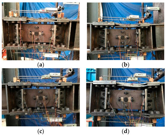 When the loading displacement exceeded 100 mm, the deformation in the flange segment was obvious, especially in the upper flange segment. The strain in the sliding steel fuse exceeded the yield strength and the plastic deformation was serious due to the extrusion by bolts. When the loading displacement approached 120 mm, the BCJ-BEDCs generally remained in stable condition, while the deformation was serious. No obvious performance degradation was found, and the damage was mainly concentrated in the connection region. The test was stopped to avoid unexpected collapse and the drift had exceeded 1/30, far beyond the drift limit required for rare earthquakes. Figure 5 illustrates the failure modes for tested BCJ-BEDCs.
