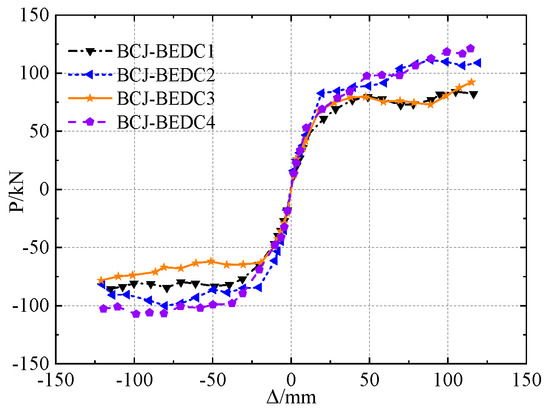 Figure 6 illustrates the load–deformation hysteresis curves for the tested BCJ-BEDCs. As shown, all the BCJ-BEDCs developed stable mechanical behavior with a plumped hysteresis loop, indicating that the proposed BCJ-BEDC had favorable energy dissipation behavior. Initially, the load linearly increased with the displacement increasing, and the hysteresis loop was small. When the slipping behavior occurred, the load barely developed and a platform segment was found in the hysteresis curves. During the slipping stage, the load was a bit reduced with the load cycles increasing, and it was caused by the loss of bolt pretension and the friction coefficient under repeated loads. The load was enhanced at a later loading stage when the collision between the bolt and the sliding steel fuse occurred. The difference between the comparison groups of BCJ-BEDC1 and BCJ-BEDC2 lied in the slip length, and it could be noted that the load–deformation behavior was different. BCJ-BEDC3 also differed from BCJ-BEDC4 in the slip length. By analysis, the development of the load deformation of the BCJ-BEDC was highly similar if with the same slip length. The maximum load corresponding to the termination of the test for BCJ-BEDC was higher if with a small slip length. The bolt-bearing mechanism helps to improve the bearing capacity, while the generation of the bolt-bearing mechanism was affected by the slip length.