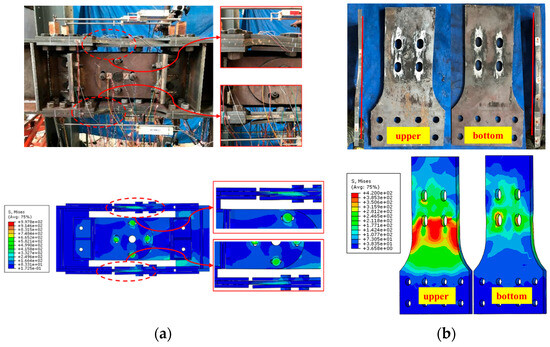Figure 13 illustrates the comparison of load-displacement hysteretic curves between the test results and numerical results, for the beam-column joint and the moment-rotation hysteretic curve for the BEDC. As seen, both the global and local hysteresis behavior obtained from the simulation agreed well with the test results. The development of the load–deformation characteristics was linear initially, and then the development of the load was slowed down due to the occurrence of slipping behavior. An obvious increase in the bearing capacity was observed at the later loading stage, caused by the bearing action between the bolts and the sliding steel fuse.