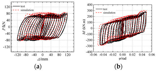 Comparisons of the hysteresis curves. (a) The P–Δ curve for BCJ-BEDC. (b) The M–φ curve for the BEDC.