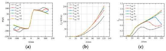The influence of the slip length on the primary performance indices. (a) The P–Δ curves. (b) The accumulative energy dissipation. (c) The equivalent damping ratio.