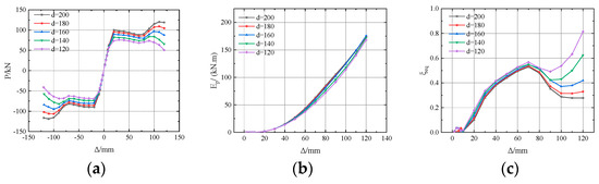 Compared with Figure 6a, the decrease in the load at the slipping stage was greater for the curves in Figure 6c, implying that a large bolt distance imposed an adverse effect on the slipping behavior. The comparison between the curves in Figure 6b,d also came to a similar conclusion. Moreover, a larger bolt distance could lead to a higher bearing capacity, and it was because the damage concentration was more serious if the bolt was arranged closely. However, the bolt distance rarely influenced the hysteresis characteristics of the BCJ-BEDC generally.